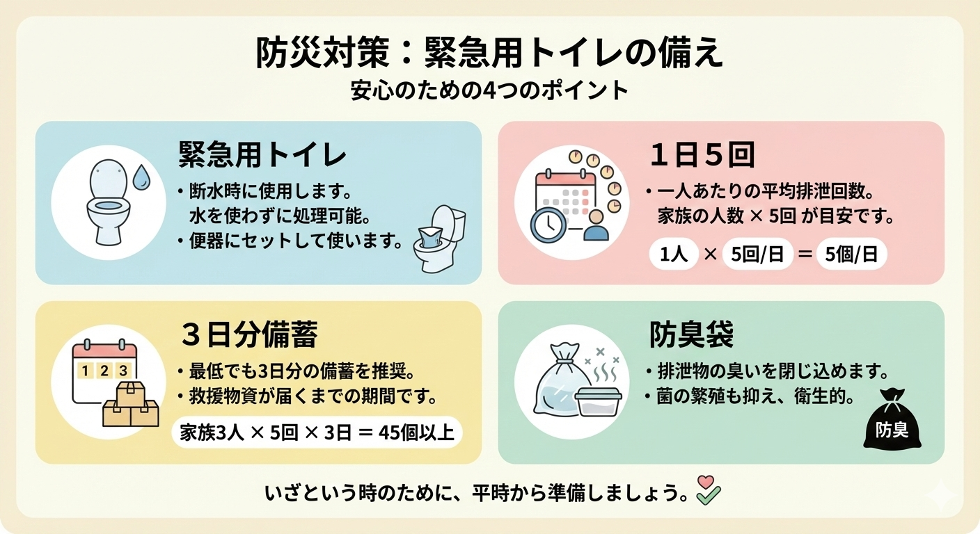 準備がなければ、ポリ袋や新聞紙で代用することになりますが、その処理の不快感や惨めさは、被災後の心の回復にも大きな影を落とします。